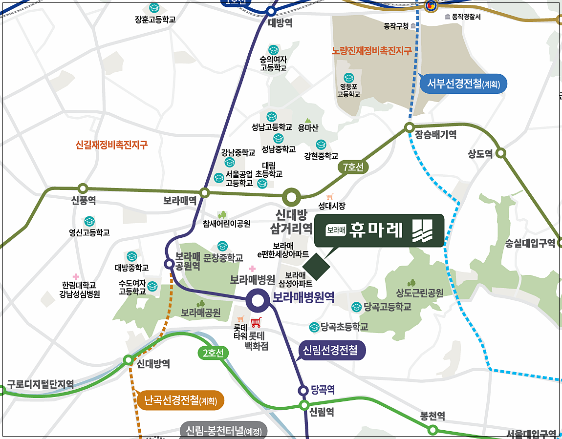 입지도 돋보인다. 7호선 신대방삼거리역과 신림선 보라매병원역을 모두 이용할 수 있는 더블 역세권에 위치해 여의도까지 10분 이내, 강남까지 20분대 접근이 가능하다. 단지 주변에는 보라매공원, 롯데백화점, 하나로마트 등 생활 인프라가 풍부하고, 서울대와 다수의 중·고등학교가 인접해 교육 환경도 우수하다.